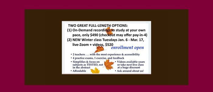 Consider our fall full-length class, now on-demand as recorded from Aug-Oct classes. We treat on-demand students the same, answering questions & giving 4 tests. Or register for the live winter class, Jan 6-Mar 17, 2026. Either way, it's taught by 2 experienced teachers, affordably. Advantages at Why Us? page.
